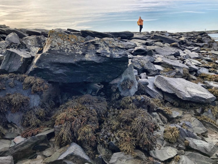 Fresh from a high tide swim, still outlined in cold, we packed our bags and set out for Barmouth. We took a winding path around the edge of the headland, under old oaks bending and twisting with burnished leaves. The bracken at the sides of the path is burn coloured and curling, dried before dying. We squelch through a thick patch of mud, look down on mats of yellowed bladerwrack just below the surface. Ahead of us we see the wooden railway bridge that crosses the mouth of the estuary, slicing between sea and sky. The slate underfoot is slashed with a hundred shades, pewter and shale and copper. We are mesmerised by the seaweed, hunch down to look at it, to poke at it, lift it, slippery, slimey, squished. Olivey golden rockweed sprouts in clusters like muppets hair and bladder wreck is tangled in rainbow shades I’ve never seen before, almost the colour of coral. There are half crescents of sunburst lichen bright against the rock as we walk on.