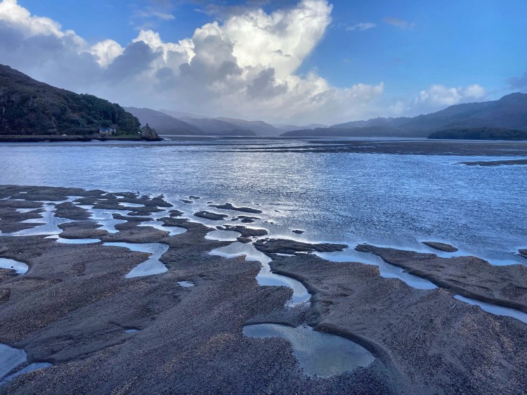 After too much time focusing on our work, we both needed air; we went out, despite the threatening rain, went across the bridge to Barmouth and ate chips. We looked at the beach, all silver and beige, the boats tipped sideways on the sand as the tide had deposited them. On the way back across the the bridge we noticed the new boards, the old ones rotting brown, deeply furloughed. Beneath us oystercatchers squeaked like chew toys, and we craned down to see them, stared at the rippled sand banks, the circular pools of water left by the retreating tides. A crow tried to fly seaward, was held motionless then pushed back by the wind. He landed on a post on the bridge, shook his feathers. We squinted at a distant shape, tried to work out what it was. It took off, wings stretched wide; a heron gliding low over the sand.