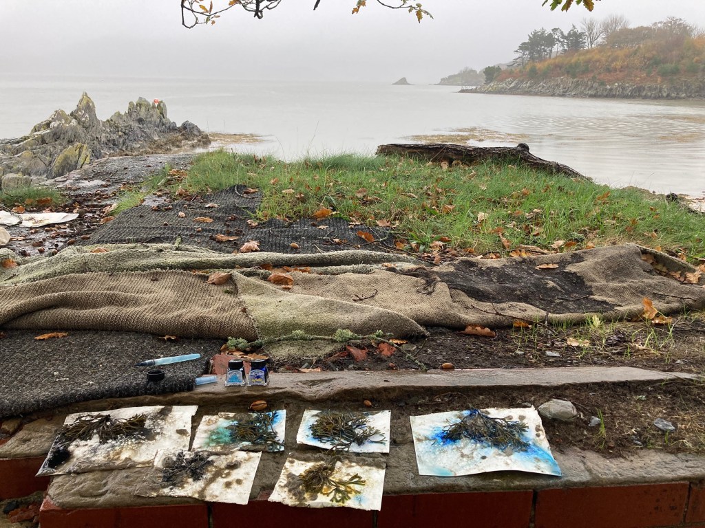 The tide was rising and, as we crouched pressing seaweed to wet paper at the edge, the rain came; heavy, relentless, whipping the water into pimples. The hills were swallowed by mist and we were quickly wet through, rain running through the roots of our hair and down our spines. We dropped ink around weed until our fingers were red with cold. The rain kept coming, spackling the paper and making new puddles dance. Later, as dusk crept in, we squelched through mud to the mouth of the estuary. The land was still lit but the water was darkening from pale grey to blue, to pewter, to steel. The mountains were black, their hulking bulk reflected in ink. We found whitewash lichen spots on the slate as the light fled. The clouds spun, dark in the water, peach banded across the sky. Cloud streets rose from the horizon to hover in mid air, indigo shifting to black. Lights popped on over the water in Barmouth and bats, tiny and trembling, swooped in the amber sky.