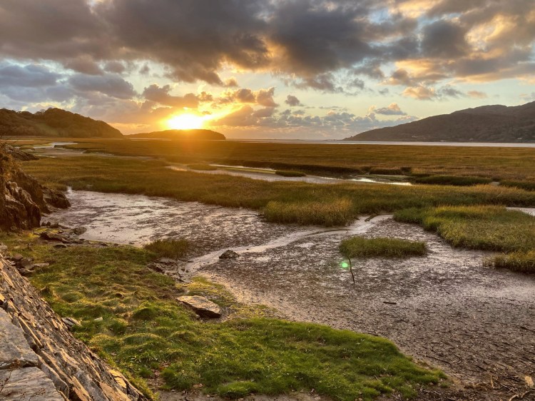 We went back up the estuary, away from the sea, towards the mud flats. We saw a curlew pecking at the sand, running as if slightly off balance. We passed yesterday’s spindle bushes and sea defences and carried on, further up, looking for more. The landscape is fascinating because it is a place of such changes; the mud left rippling wet hours after the water has fled, seemingly low lying humps still visible at almost high tide. We passed the remains of a building, roofless, right on the banks, it’s walls crumbling. I go in, clamber over fallen bricks that once made rooms, duck under the limbs of a not so little tree, grown tall since the time this house fell. The remaining walls are built of big old stones, not something that feels reminiscent of a military past; this feels like a home. At the point closest to the estuary the stones have fallen away, a gap toothed grin to the view. Undulating mud banks thick with rushes and gold green grasses stretch away. The light, brighter over Barmouth bridge in the distance, reflects golden in the sinuous pools. We stop on a bench to draw. A noise, right by my ear, and I jump; a robin, so close. He hops onto a willow branch right behind me, ducks his head, moves to the bench, down to the floor at our feet. He flits across the path, his wings loudly fluttering, then flies at me, starts at my feet, flies fast up my leg, along my torso, only inches from me, to pass over my head and land in the willow again.
