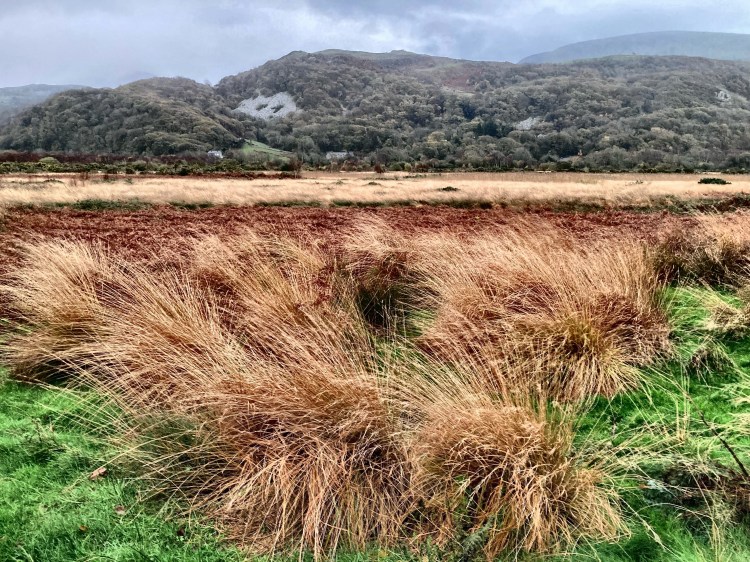 Today I woke at 5.45 because that was the time of the tide. But it was still black outside and rain was battering down. My bed was cozy and I rolled over, went back to sleep. The rest of the day it rained. The sky was thick with cloud, the mountains disappearing, shadows of grey, peaked layers on the horizon. Rain spat at the windows, agitated the puddles. The tide pulled back, bladderwrack left in yellow clumps on the empty sand. A curlew pecked on the beach and a shag preened on the edge of the emerging sand bank. Bit by bit the bank emerged, tiger stripes emerging from retreating grey, growing, colonising the centre of the estuary stream. In the afternoon, we went out. Up behind the houses again, up into the woods. We climbed past a broken slate wall, out onto an outcrop of rock. The landscape was stretched below us, a space we’d come to know from ground level now laid flat and tiny, for us to look down on and assemble, all the small paths, the walks joined up. Fairbourne on the horizon, low limbed, the marsh in front of it, water filled cracks making round edges of moss. Barmouth across the water, boats on the sand, dunes pushing into the narrowing neck of the Mawddach. How is the neck so narrow with all that force of water flooding daily? Why has the long arm of Fairbourne not been washed away? They say by 2050, Fairbourne will be drowned. Endless amber curls of bracken fell away beneath our feet. It started to rain, whipping hard, beads smattering my glasses. We could see the clouds, the shaky air on the horizon all around. We walked down the mountain, grass so sodden it floated atop inches of water. We walked home by the road, curving under cackling trees, everything washed and jewel bright in the wet.