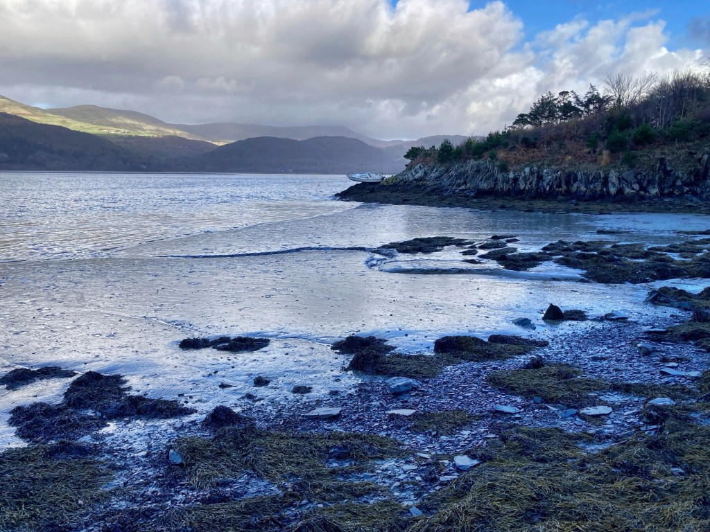 Our last day! Woke up early to watch the light come. In the night I’d heard rain on the roof, hammering at the covered skylight, but by the time I was sat by the window the day was dry. The world was blue black and slowly, the light trickled in, sky lightening first, then water. The mountains were last, holding their hulking blackness the longest, till all the rest was grey. I went out for a final swim from the steps. The tide was at its highest and the white boat that had appeared the day before, seemingly marooned on the rocks, was floating innocently at anchor. The water was cold. The seaweed, mustard yellow, clumped beneath the surface, bubbles breaking as wind formed waves rocked against the sea wall. I went down the steps till the water hit my waist, counted to three and kicked off. Though the sky was grey, in the water the world was blue. Steel and indigo slipped and slid against each other in shifting shapes as the water moved, dazzling, dancing, never still. I swam out to Jeff, buoy 2. For the first time, rather than just tapping him, I swam right the way round him. I waved to Emily 2, resisted the urge to swim to her too – I didn’t have as long to warm up post swim and I was alone, so I didn’t risk the extra time in the water. I swam back toward the steps, cricking my neck to watch crows stretched against the sky overhead. Before I got out I kicked a slow circle, took in Barmouth bridge, the hills, the upstream tide flowing to the distant mountains, the bay, the trees, the crescent where we’ve been so inspired, so fulfilled. I swam back, got out, jogged around the kitchen to warm up.