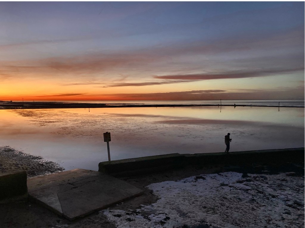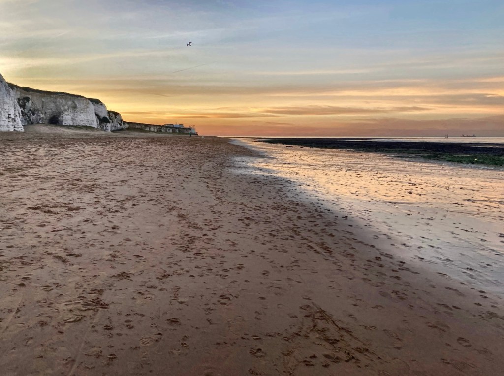 The next day we went to the beach as the sun lowered. I swam, the water so cold I got an ice cream headache without putting my face in. Then we walked along the base of the chalk cliffs. The sand was deep, shifted by weather or a storm, and the railing that usually descended at the edge of a ramp disappeared into sand as soon as it dipped. We worked through it, feet slipping, and the sky turned pink. The wet sand threw back the colour as the tide retreated. A pigeon cooed repetitively in a hollow in the cliff. The the sky flared orange and peach, turquoise and yellow, blue and white in bands across the horizon. Brilliant colour was reflected in all the rock pools and the huge steamer on the horizon became no more than lights.
