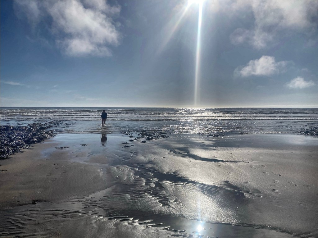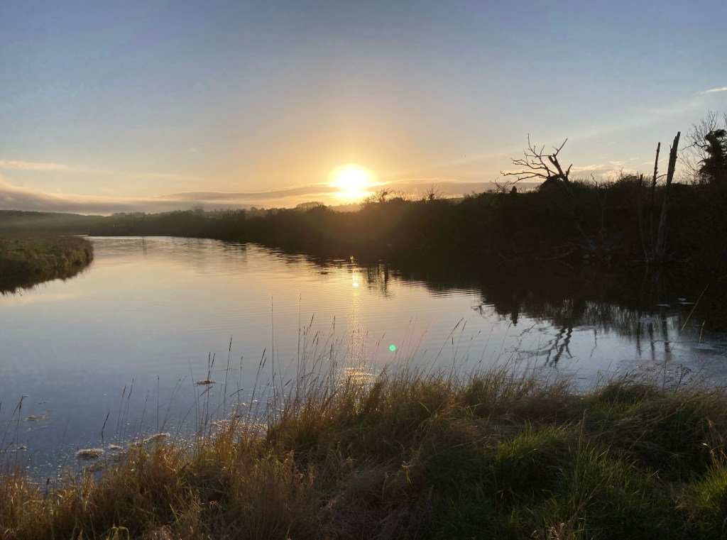 When we got out, we weren’t cold. We saw two whelks making slow progress along the sand, long trails behind them. One had done a loop, changed his mind and turned round the other way. As we walked back through the marshes, we saw a little egret picking its way through the muddy water. The sun went behind low cloud and we could hear skylarks whirring and warbling in the bushes. Just before we left, the sun came back, low now, reflected gold in the still, marshy water.