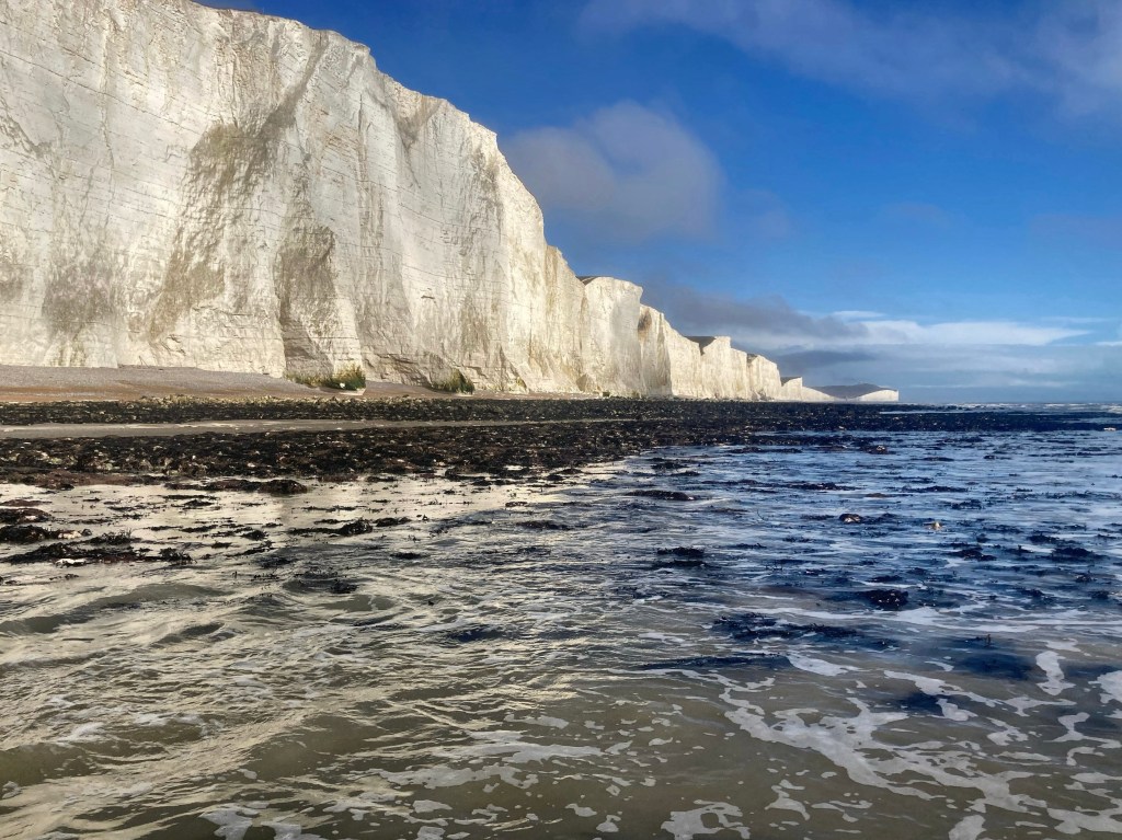 It was low, rushing breakers hurrying in, and we walked away from the river that fled into the sea, toward the foot of the huge white cliffs. The shingle shifted, making every step a wobble. Between us and the sea were chalk boulders, weathered into curves and colonised by black weed. We paused and looked up, the cliffs indescribably big an ice us, hills wheeling along the white edge above. In a big hollow, the sound of the waves was echoed back, a soft but steady roar. We changed and went into the waves, into water no more than waist height but waves that broke and soaked us. Between swells we ducked and swam a few strokes, popping up to jump the coming crests. The sun was strong, glittering off the shattered white water lace around us. Looking back we could see the seven sisters fronted by foaming water.