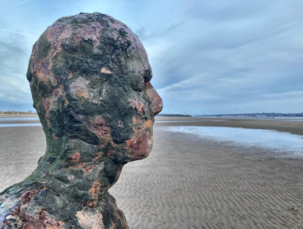 An oyster catcher peeped repeatedly and a flock of small gulls took off, flying low above the glittering mud, their shadows following them as they landed again, closer to the tide line. We reached another statue, this one thick with acorn barnacles, tight packed like tentacles or a hundred hungry mouths. Over the iron man’s head and shoulders he wore a flowing mane of green. Each strand was distinct but it wasn’t soft to touch; it had been fused solid by the pressure of saltwater.