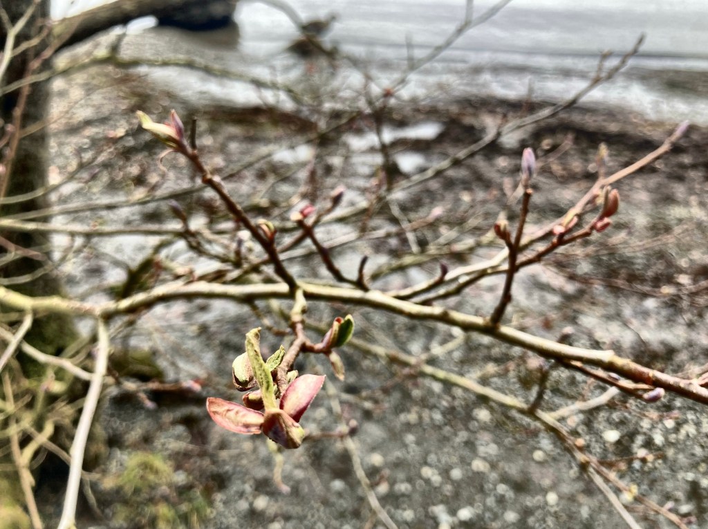 We went through the woods, where white wood anemones dotted the leaf mulch and followed the path beside the lake. There were buds on spindly branches, pink or pale, not yet formed into flowers. Elsewhere, green shoots pushed the pink confetti of cherry and apple blossom aside.