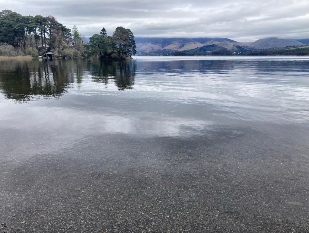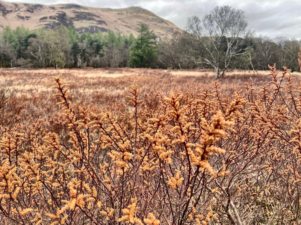 We started on the road at the national trust car park, after talking to a ranger about the amount of rubbish left behind. We reached a gate and turned across a field, the lake and the mountains to our right across the long grass. We crossed a bridge and paused to watch a dog madly swimming after rocks thrown for him, not minding that he never fetched anything. The path became a raised wooden walkway above marsh land, sticky treacle pools and reeds, patches of moss and lichen and wet wallowing shrubs. A great swathe of land was covered with rusty bog myrtle, spreading amber across the almost monochrome landscape.