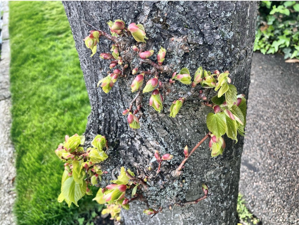 A wall that had been thick with ivy all winter had been cleared, and I missed the colour of it, all its shaggy mess. I could still see the little tiny suckers, the fronds that had held the stalks in place, on the pale brick. We walked slowly past a tree trunk with lichen patches that looked sponged on, then another with budded leaves, pink at their bases before unfurling to green, growing at waist height, bursting from the trunk. There was something about this determination, this striving toward life, that struck me.