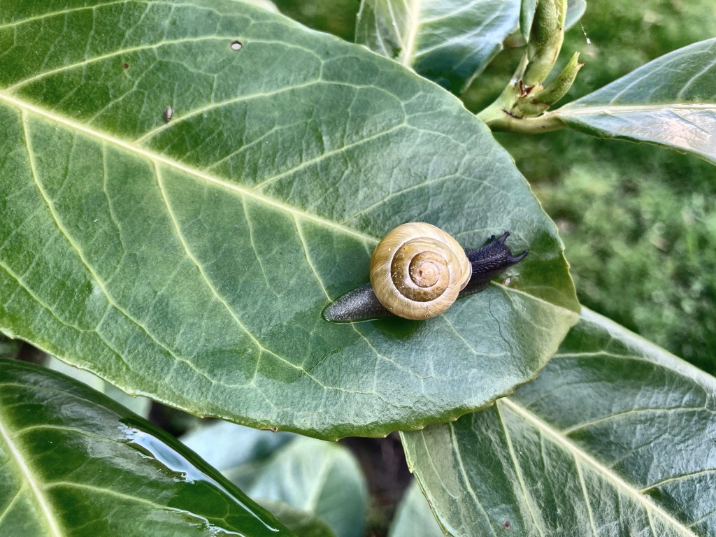 People nodded hello as they strode along and we kept moving slowly, past the tiny blue ankle height flowers of green alkanet, the white burst of Mexican orange. When we stopped for a pause I noticed a snail, tiny, stretching its body forward over a leaf, it’s shell bobbing.