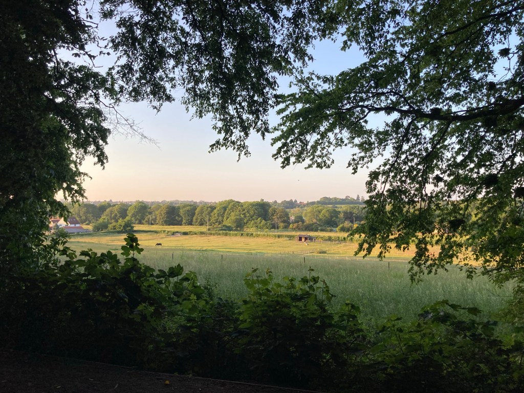 The path was blocked by water works, so we turned up the hill instead, past two horses munching in a field, then into the woods. At the crest of the hill the trees thinned and the roadside was thick with tall bright daisies. The air was still and heavy and the world felt solid. Turning back into the woods again, we passed twisted oaks and huge old tree stumps. We sat on a bench looking out through a crack in the canopy. All the fields were laid out below, the road, then the river, beyond. The light was gentle, dropping into the gold pink of sunset, and we turned and went back to the house.