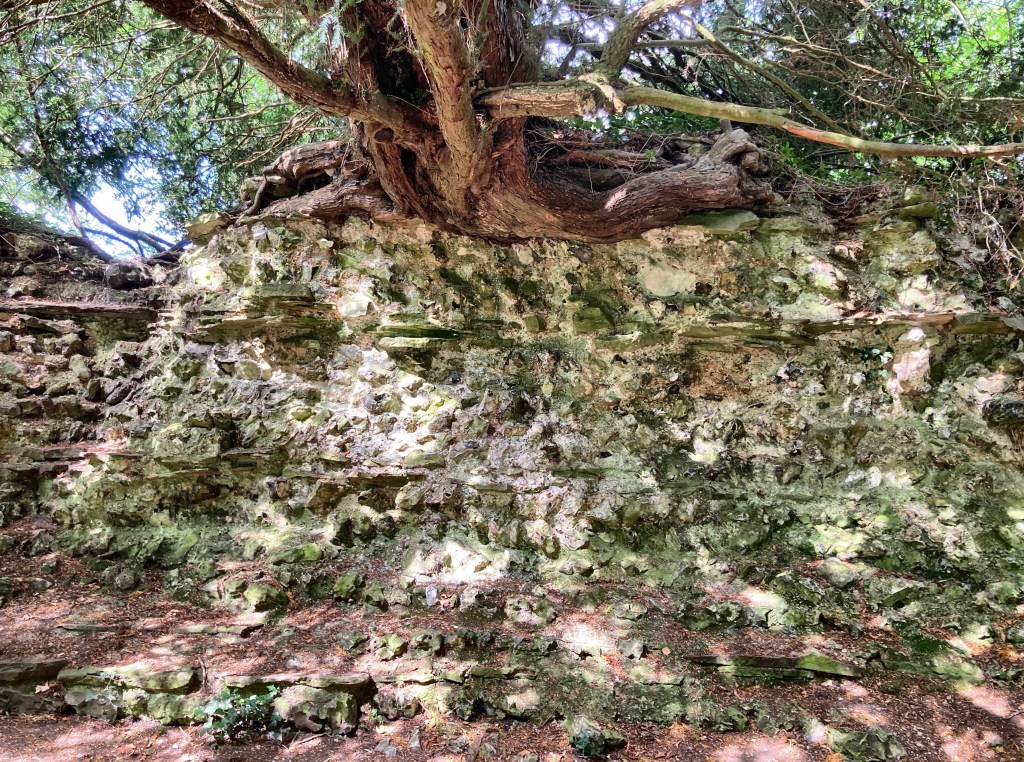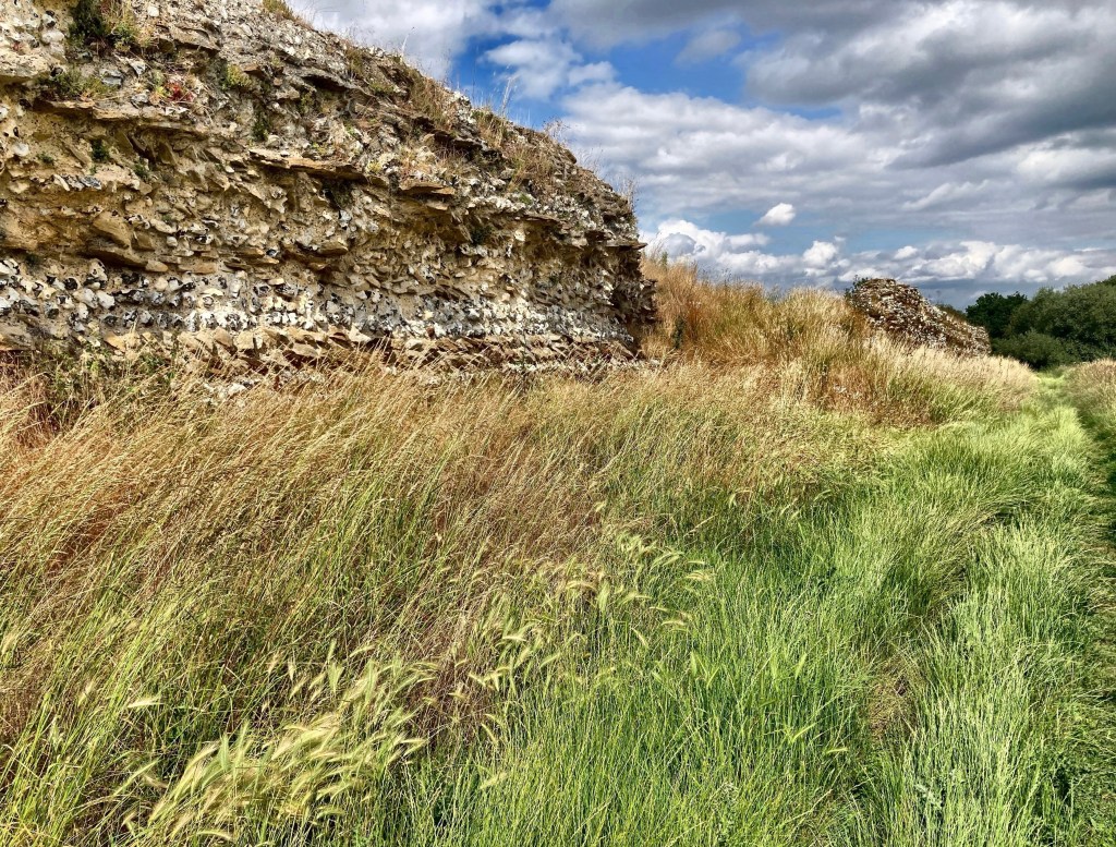 At the weekend we went to the old Roman town of Silchester. From the car park, the path followed the edge of a field, where circular bales of hay stood proud on the fresh shorn grass, now yellow from the sun. Through a couple of gates we turned right, following the bridleway where it dipped through the trees. The track narrowed and twisted and then we saw the first bit of the old Roman city wall, the roots of a tree lunging out above it.