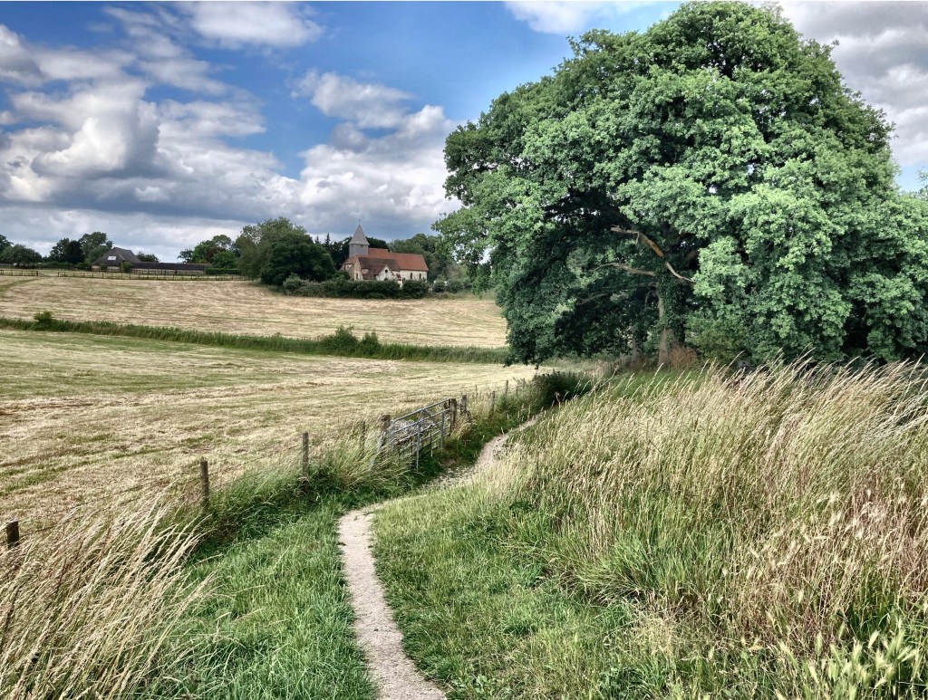 The path ran in a ditch beside it. The long golden grass rustled and danced in the wind and butterflies – white and blue and peacock colored – fluttered up and out as we passed. There were thistles dotted around, their purple flowers bursts of colour, and cow parsley, hog weed and bind weed adding white. We found a gap and climbed to the top of the mound, so we were level with the wall. From there we could see the size of the space the wall encompassed, divided into a patchwork of fields. There was a church ahead and the path curved towards it, narrowing at points to a scramble past snagging brambles.