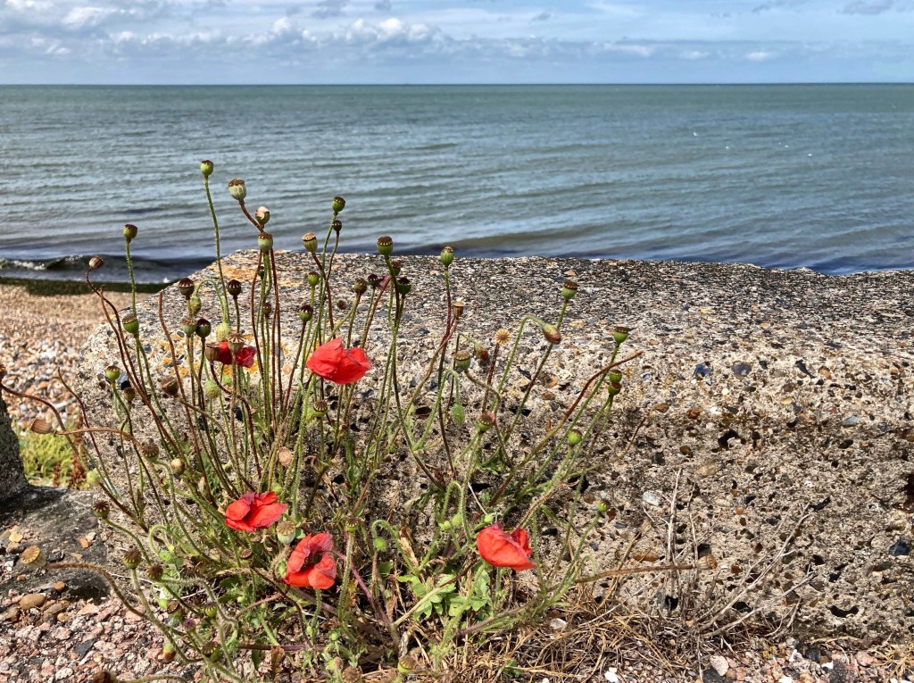 Yesterday it was so windy it was an effort to walk into the face of it, but we pushed on. We were on the edge of the ocean, a raised path between the fields and the heaving blue sea. The long grass, the green leaved crops, the yellowed fields all whipped in the wind, constantly moving, shushing and murmuring as they danced. A small poppy plant had wedged itself between the low sea wall and the path and it shook in the breeze.