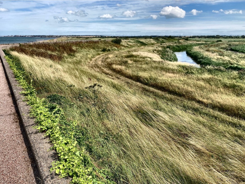The sea crashed onto the shingle then pulled back with a crackle of released stone. We passed two low lakes almost empty of water, dotted with black headed gulls, all resting in the hollow where the wind abated. The train tracks across the field were silent, empty, and the path had only a handful of dog walkers, a few whizzing cyclists. The wind had kept most away. We saw another butterfly, a peacock, dance across the air in front of us then settle, still, wings open, on the low wall beside the path. It opened and closed a few times, it’s orange spots watching us, until we shifted slightly and it flew up, off and away to another perch in a distant bramble bush.