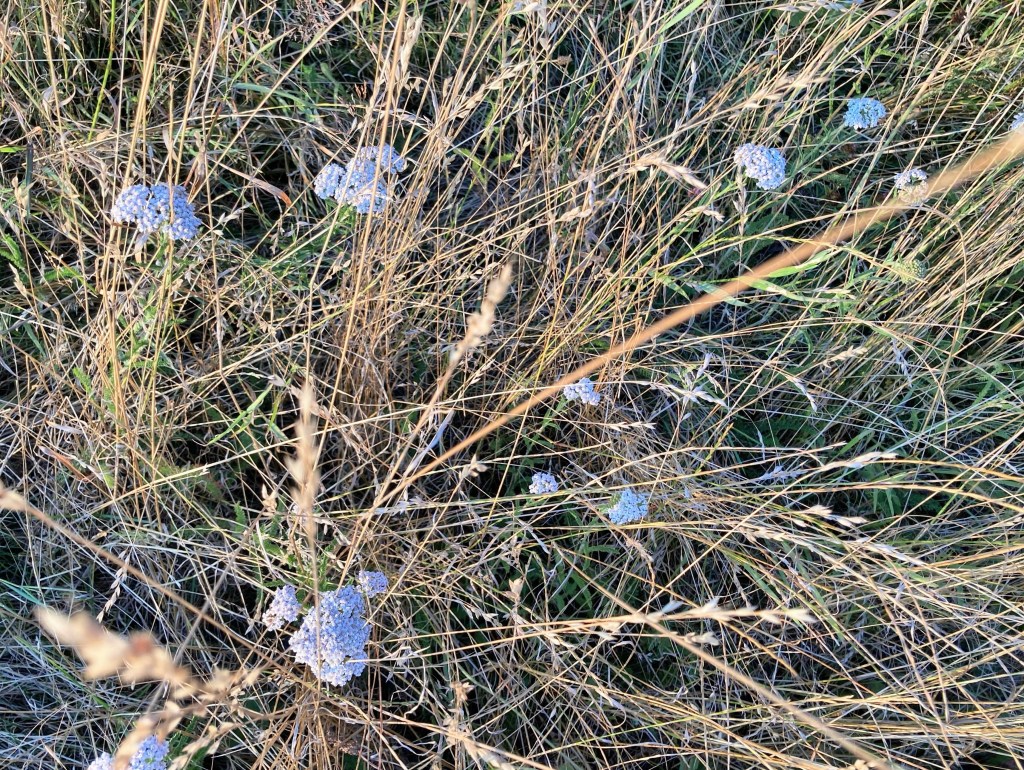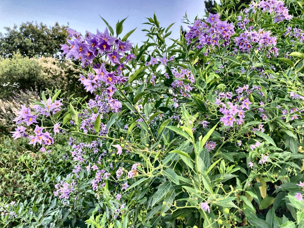 Another stile, another field, squeezing past brambles and then the gold grass, stretching away, the path dropping in a graceful curve away from a single oak, to where the burnt ball of the sun shot its last rays over the trees. There was cow parsley, mallow and mugwort beside the path, two huge buddleias, one purple, one white, and a pretty bush of purple stars I think was bittersweet nightshade. There were grasshoppers and crickets churring invisibly and I watched a bee dance over the yellow head of a ragwort bloom.