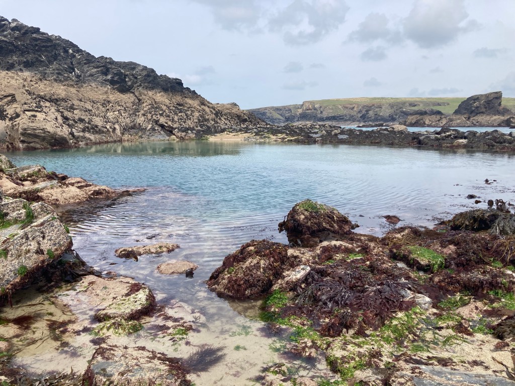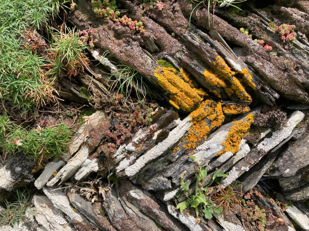 We walked beside a wall that was coloured by lichen, it’s weathered stones slotted on diagonals to make a wide zig zag. The sea was beside us and we could see the white water where the waves crashed in at the base of the stacks or where rocks were high beneath the water. We rounded the cliff edge and descended to a small bay, mostly rock at low tide, with a small river running out to sea. We wobbled across on treacherous stepping stones, then climbed the other side.