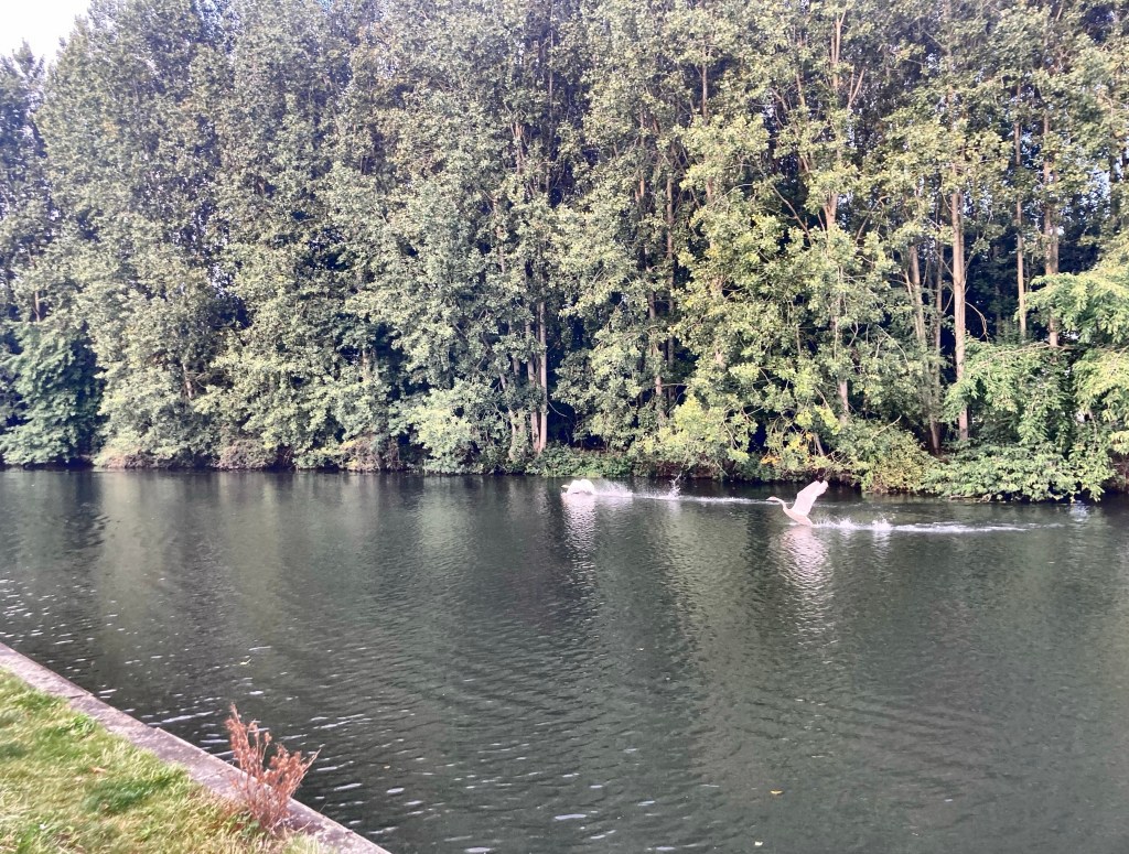 I pass the moored boats, checking under the overhanging branches where the heron used to hide, but he’s not there today. I see two moorhens and a baby, big as his parents now, but still fluffy, his black feathers grey spiked, like wire on a brush. I go past the lock, the bottom gates open so a steady rush of water trickles out. On the other bank there are tall willows, and as I stop to watch the wind ruffle them three swans round the corner, two parents, a cygnet fully grown but still grey. They start to flap, noisy, honking, wings beating the water, feet trailing just above it as they take off. Their white wings are so powerful, so loud. They take flight, disappearing down the river, but the cygnet hasn’t got the hang of it yet, doesn’t quite manage to take off. They are gone and he stays, alone, swimming along the black canal corridor calling for his family.